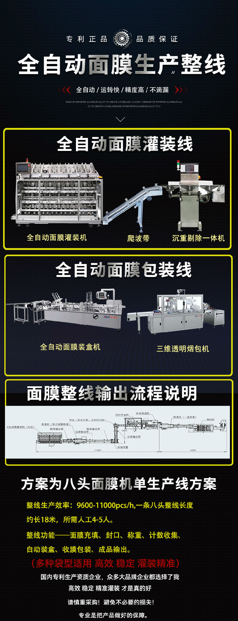 同時面膜灌裝除了以往的單線面膜灌裝,我們又著手研發和試驗成功了六頭面膜灌裝生產整線,八頭面膜灌裝生產整線,十頭面膜灌裝生產整線,整線又分為,單線,二線合一、三線合一和智能機械手、AGV全自動全方位全自動智能化