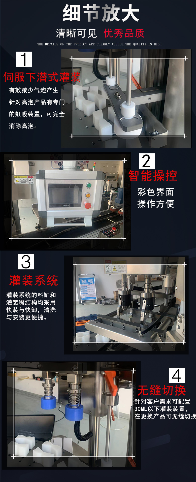 本產品是從事面膜產品的充填和封裝一體化的專業(yè)設備,具有衛(wèi)生,環(huán)保,高效,節(jié)省人力成本,占地面積小等特點。全觸摸屏+plc控制,動作高效,迅速,簡潔,四頭理論速度可以達到7200片/小時,十頭更多